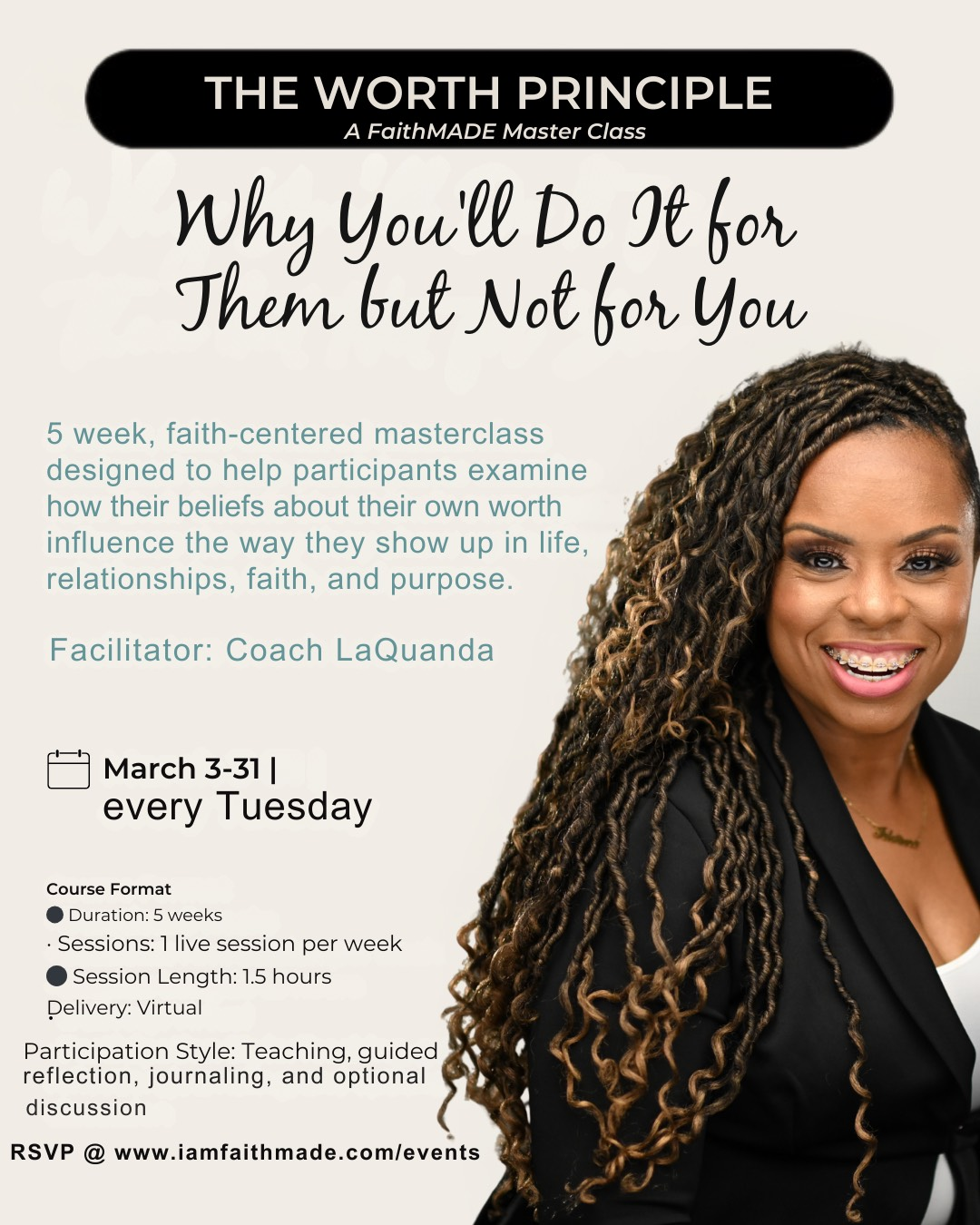 The Worth Principle is a five-week, faith-centered MasterClass designed led by Coach LaQuanda McCoullum to help participants examine how their beliefs about their own worth influence the way they show up in life, relationships, faith, and purpose.